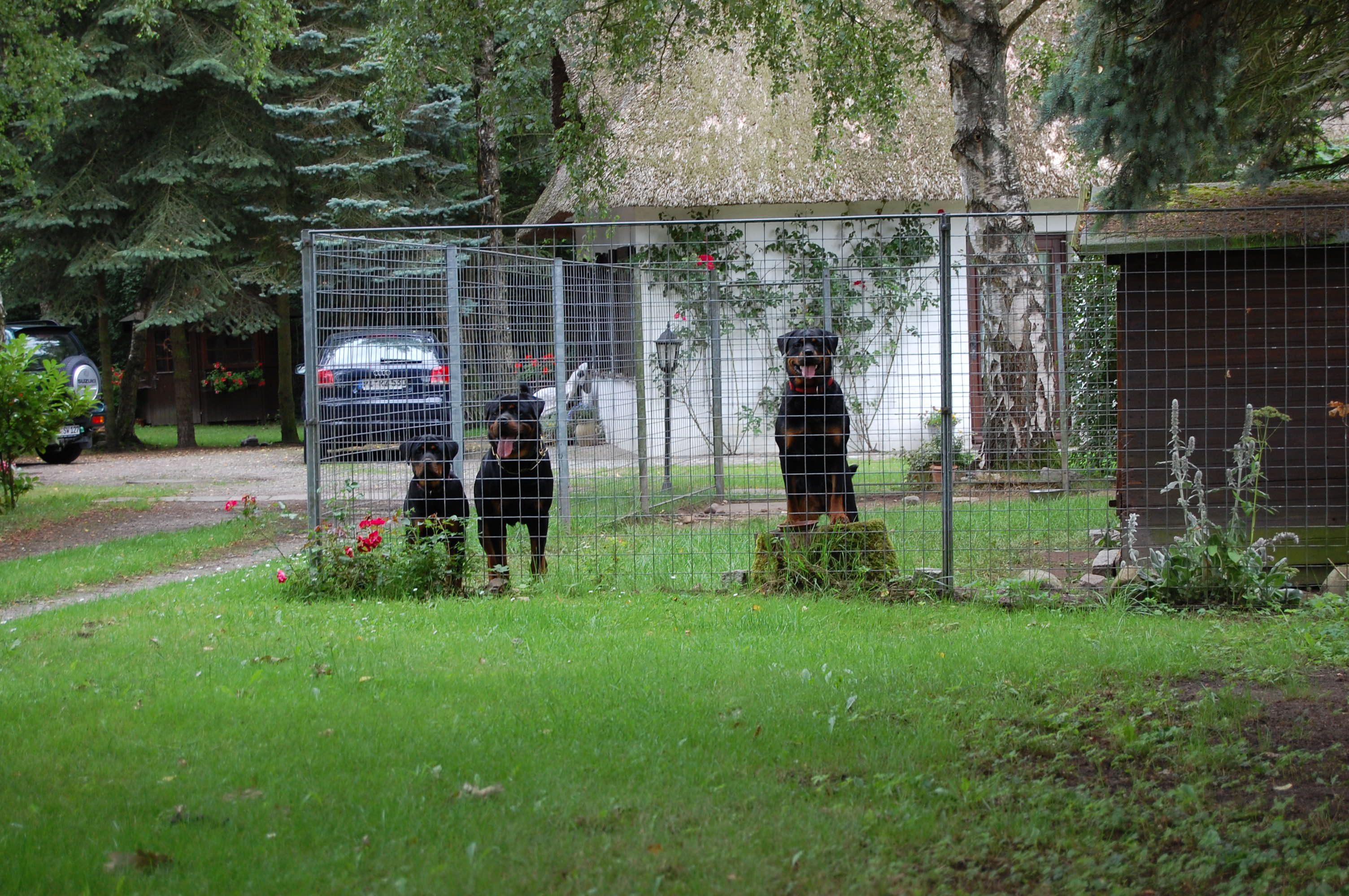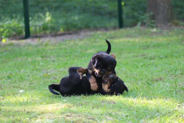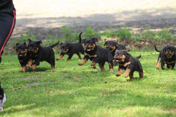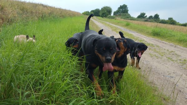 We breed Rottweilers with famous German pedigrees and lines. All adult Rottweilers and rottweiler puppies possess sound temperaments, healthy powerful bodies, excellent massive bone structure, working ability, and extremely high intelligence. These dogs are calm, trainable, protective, courageous and devoted to their owners and family. Obedience training is essential.